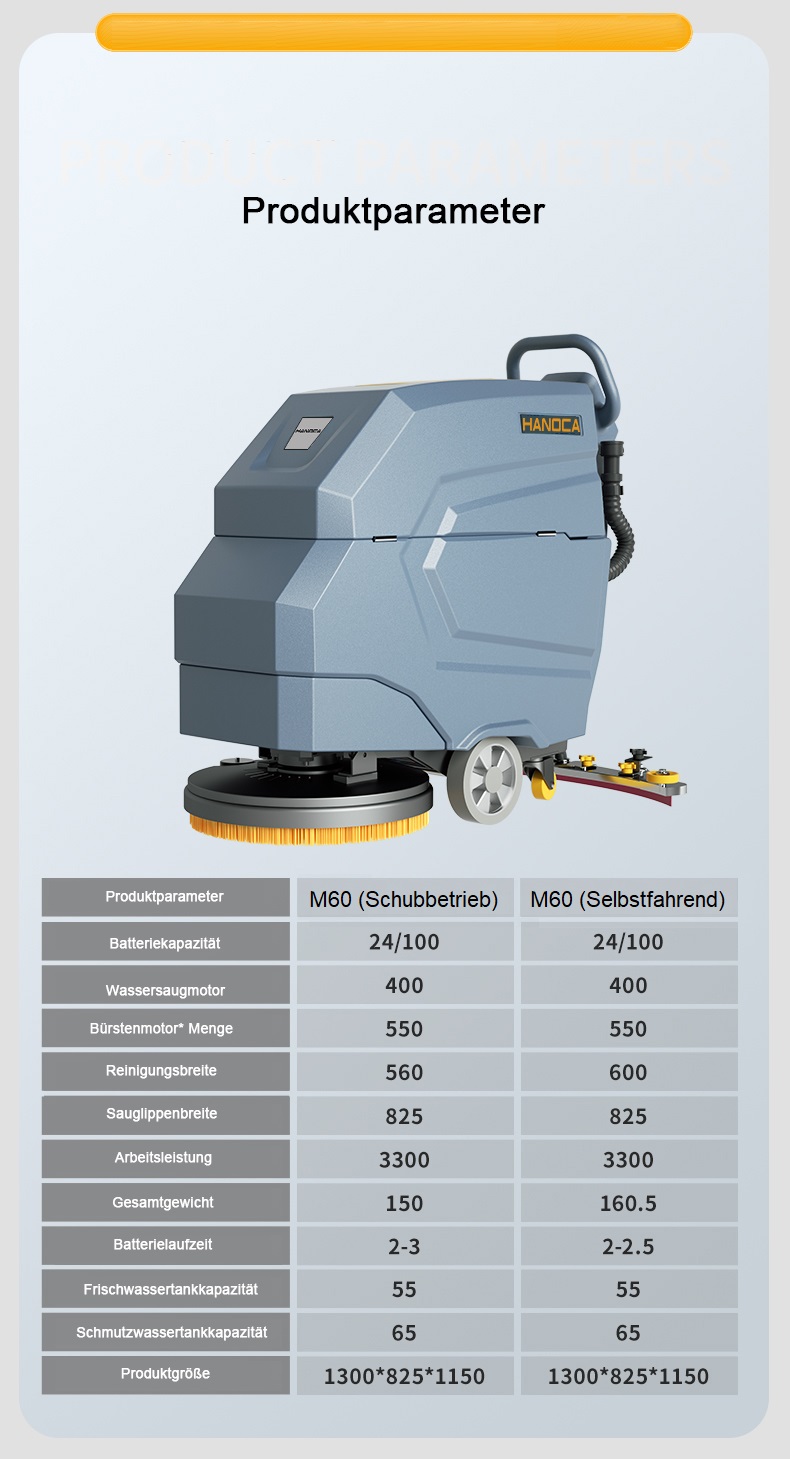 • Ein selbstfahrender Bodenreiniger, der Waschen, Schrubben und Staubsaugen in einem vereint. Sie können vorwärts oder rückwärts durch einen Schalter steuern, ohne die Maschine schieben zu müssen, was die Arbeit einfach und komfortabel macht.