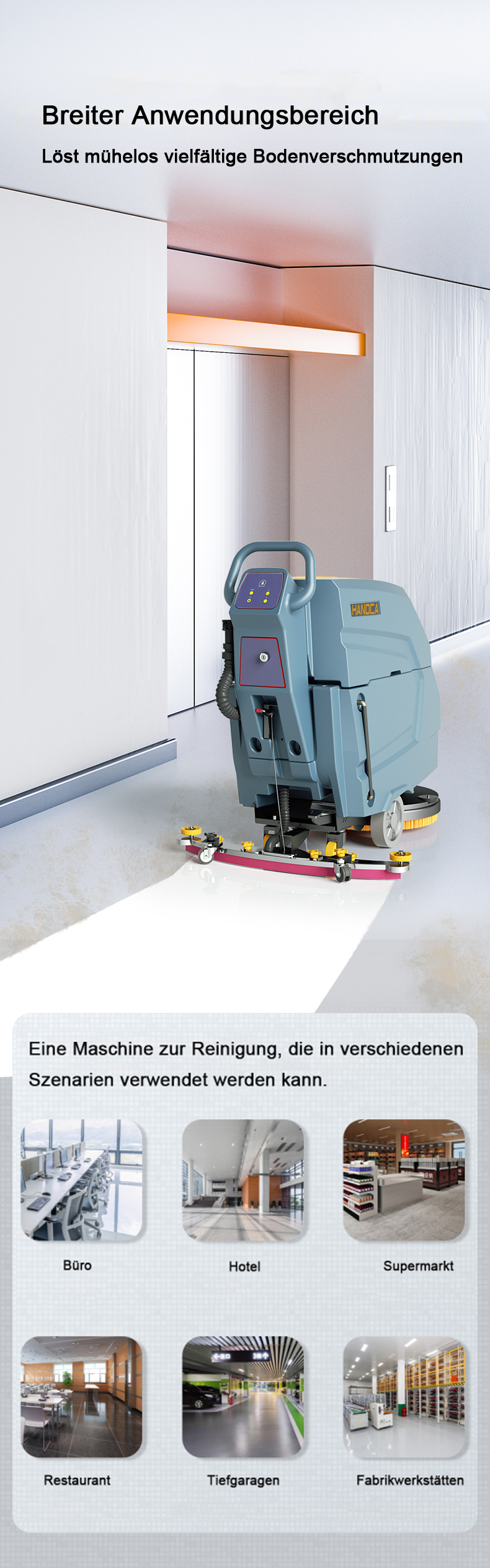 Dieses Gerät kann in verschiedenen Szenarien eingesetzt werden und eignet sich für Gewerbe und Industrie, wie Restaurants, Schulen, Krankenhäuser, Fabriken, Einkaufszentren, Supermärkte, Büros usw. Es kann verschiedene Bodenbeläge wie Epoxidharzböden, PVC Böden, Terrazzo, strapazierfähige Böden, Fliesenböden mit Zementbasis, Holzböden und Gummiböden reinigen, indem unterschiedliche Bürstenaufsätze für verschiedene Materialien ausgewählt werden.